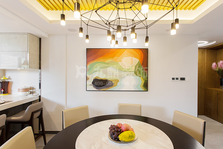 1、在色系的运用上,大部的色调以浅色作为主色调,稍微用亮色进行点缀。从视觉的角度上来说,浅色与深色相比,是一种较为舒适、柔和的色调,再加上少许的亮色点缀,会使整个空间既有和谐统一的感觉,又突出了视觉层次感,给空间增添许多生气和温度。