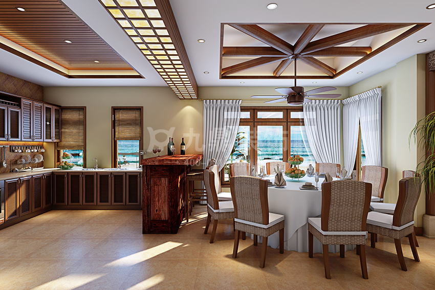 餐厅灯具造型不用太繁琐:灯具造型不宜太繁琐,以方便实用的上下拉动式灯具为佳,也可以采用发光孔,它散发出的柔和光线,既能美化空间,又能够营造亲切的光感。