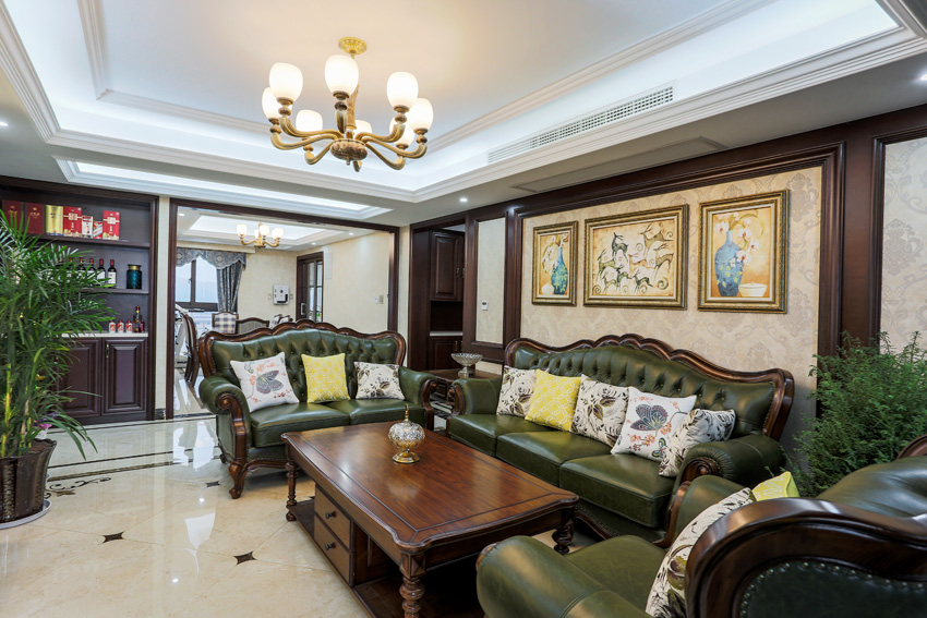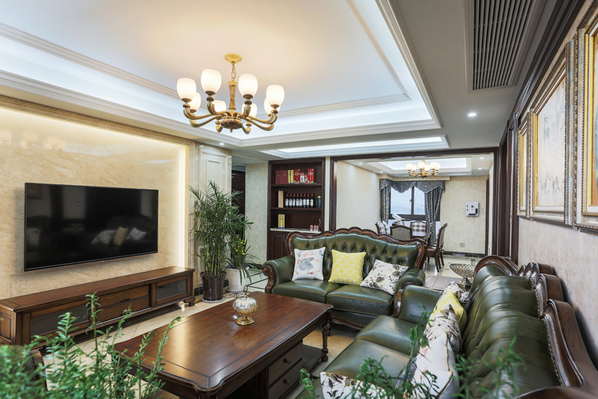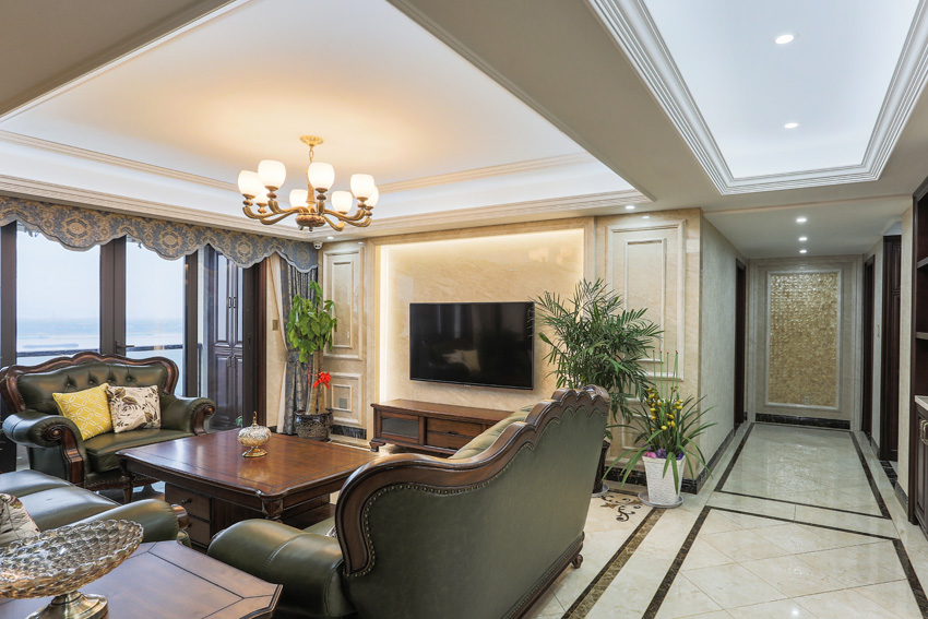 客厅配饰:对称的吊顶、对称的沙发、电视背景与电视柜的搭配,俨然的古典纠缠与碰撞中产生戏剧性的冲突,向新古典提出的叛逆和挑战。