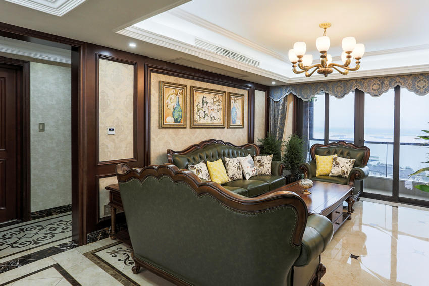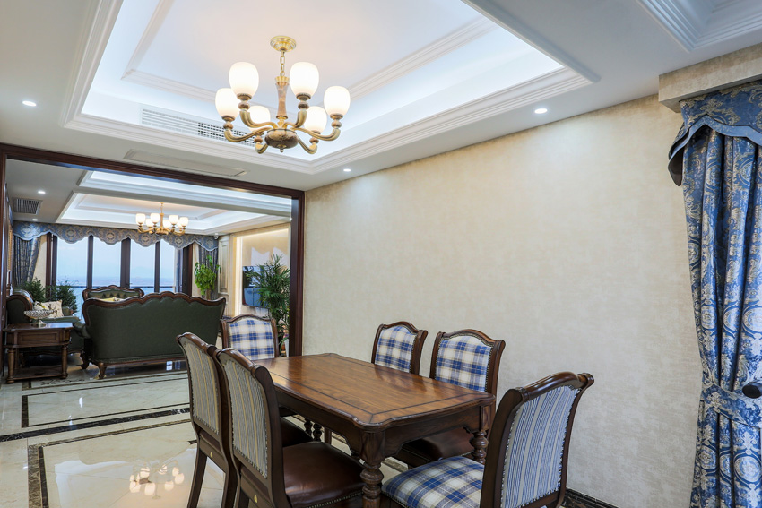 石膏线吊顶造型,采用欧式新古典的线条多重叠的体现,并一脉相承,在门、餐厅、沙发椅相呼应,勾勒出一个新古典的艺术空间。