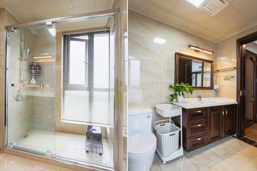 抛弃传统文化瓷片的使用,采用纯净厚重的加工砖与深色的厚重的欧式浴室柜的搭配,会使卫生间在这种清爽奢华的装饰稳重下来。
