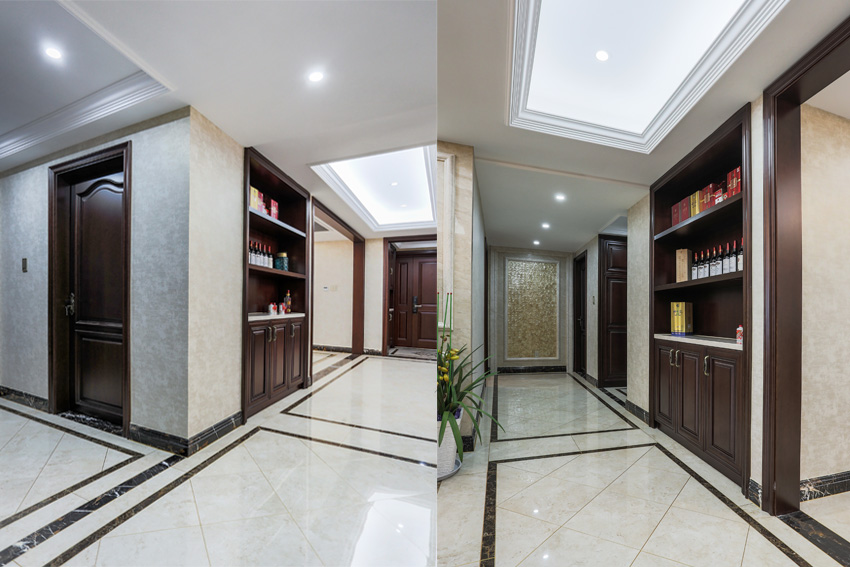 电视墙的石材、过到尽头的金灿灿的贝壳墙、壁画、小美的家居充盈其间,流淌着优雅的贵族气息。