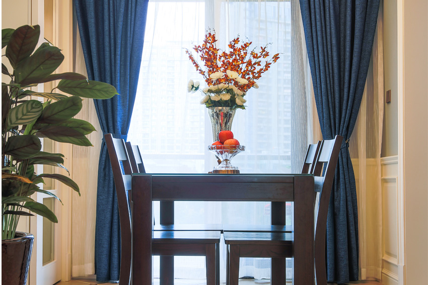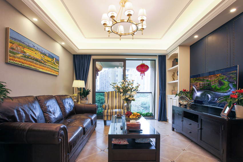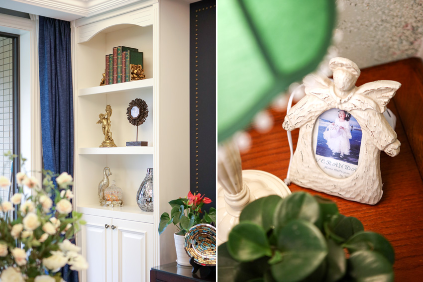 客厅空间的背景面尺寸偏小,我们采用了深蓝色硬包形式,加做旧铜质铆钉,在客厅角落里增添了一组装饰性柜体,满足了客户个人收藏的一些工艺品的展示区域。