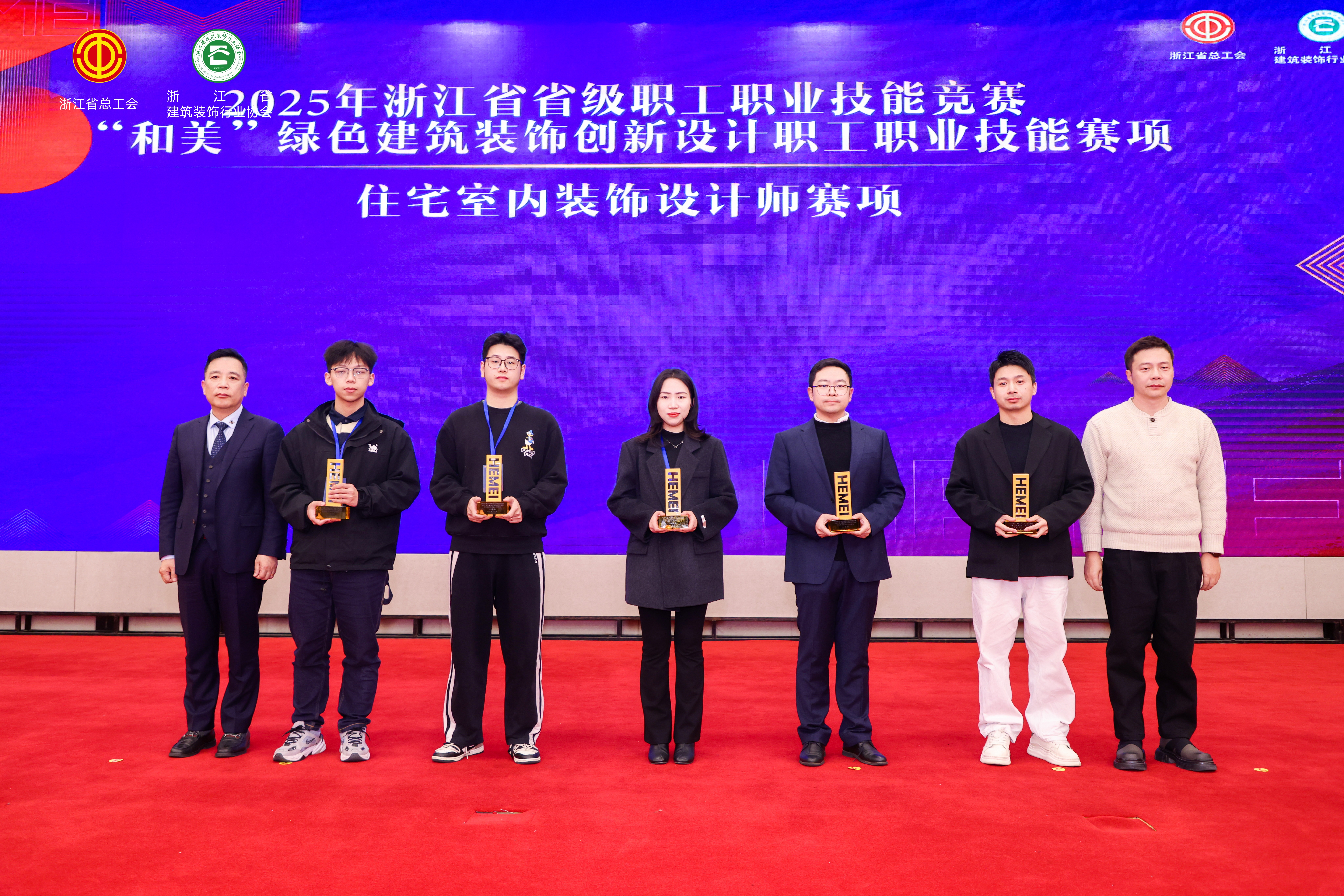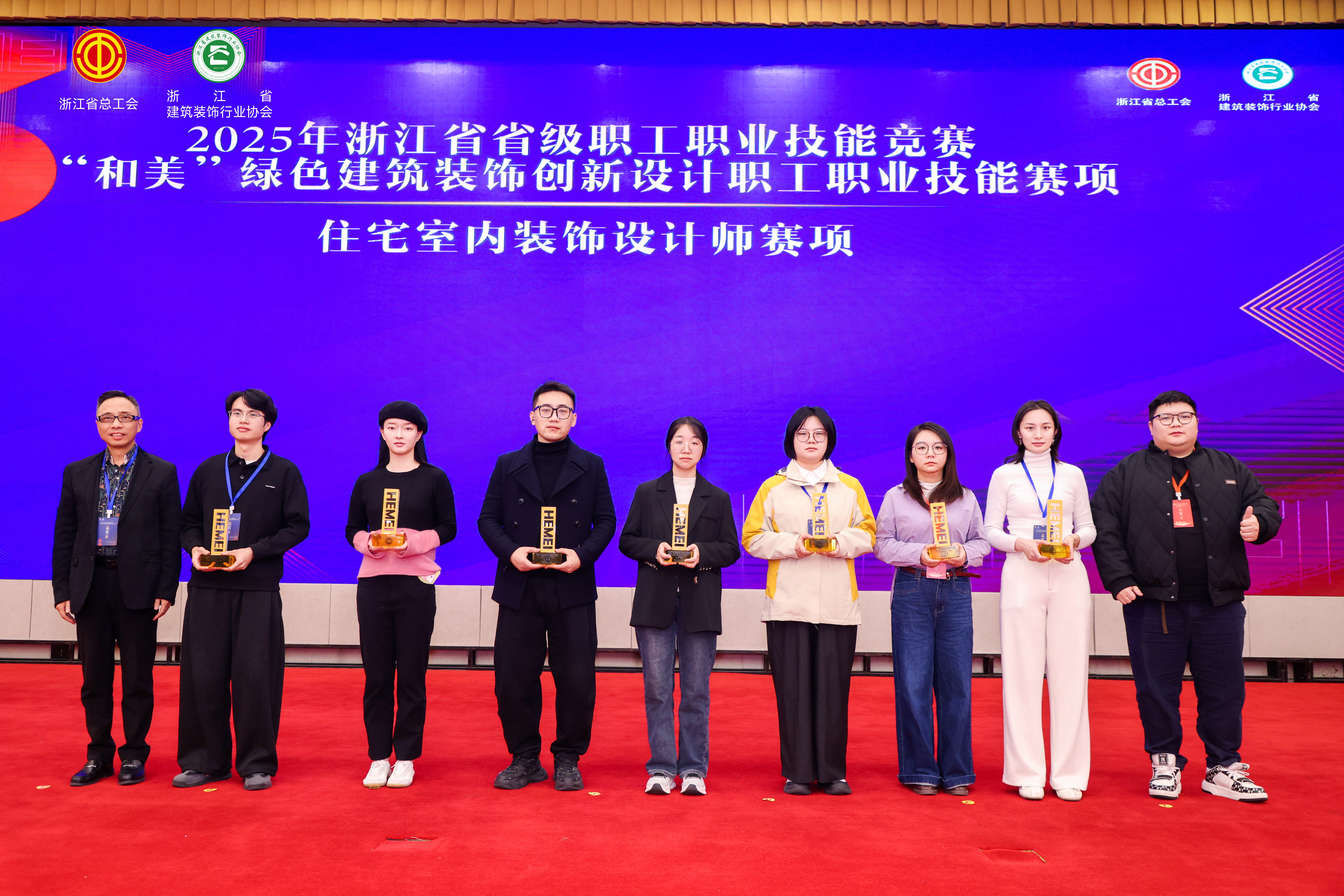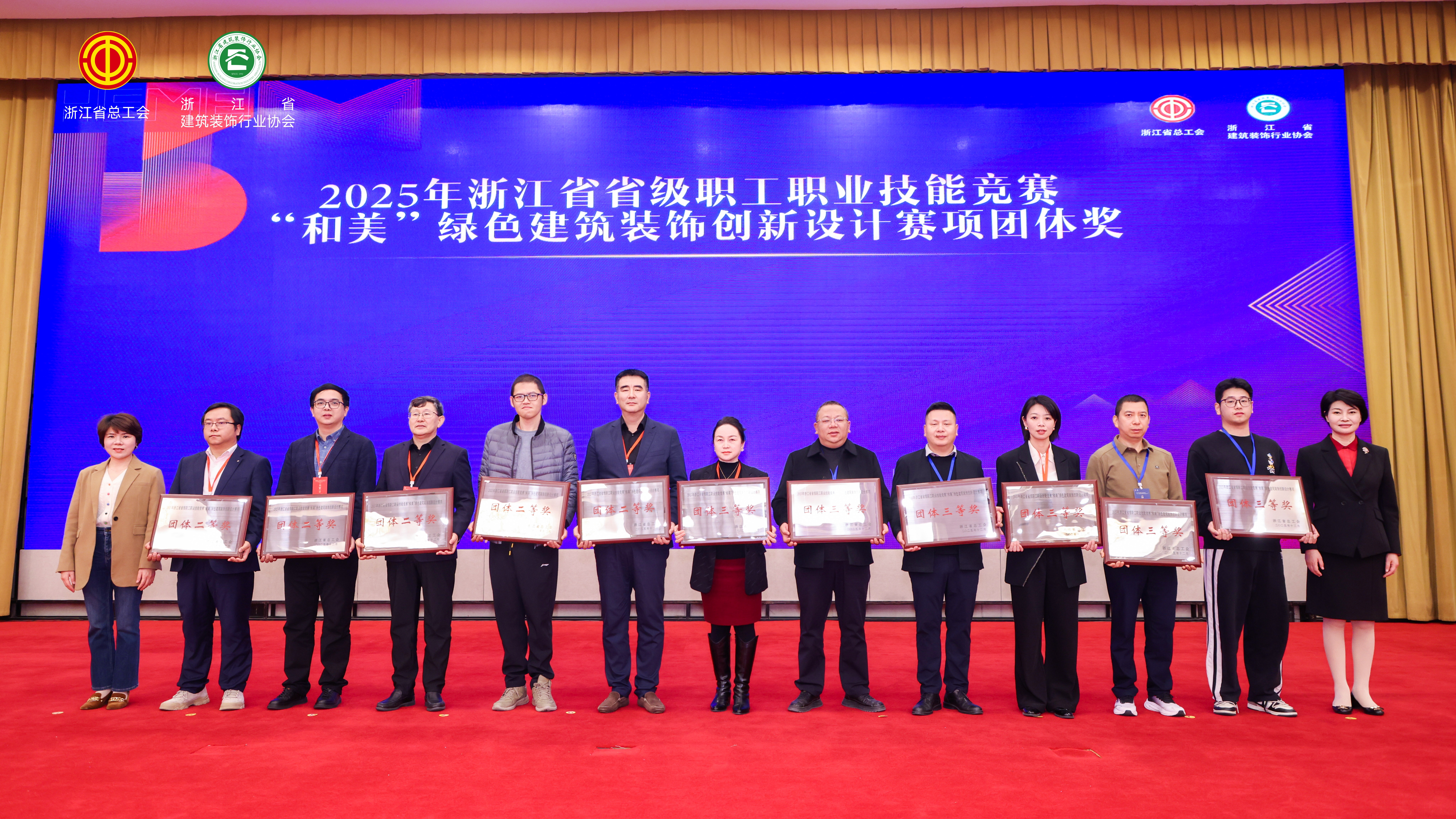 2025年12月6日,在由浙江省总工会主办的 2025年浙江省省级职工职业技能竞赛中,备受瞩目的 “‘和美’绿色建筑装饰创新设计”职工职业技能赛项举行了颁奖典礼并圆满落幕。九鼎装饰在此次权威赛事中表现卓越,不仅在团体赛中展现了强大的综合实力,更有多位设计师在个人项目中脱颖而出,共斩获一项团体奖与四项个人大奖,成为本次大赛中备受关注的焦点。