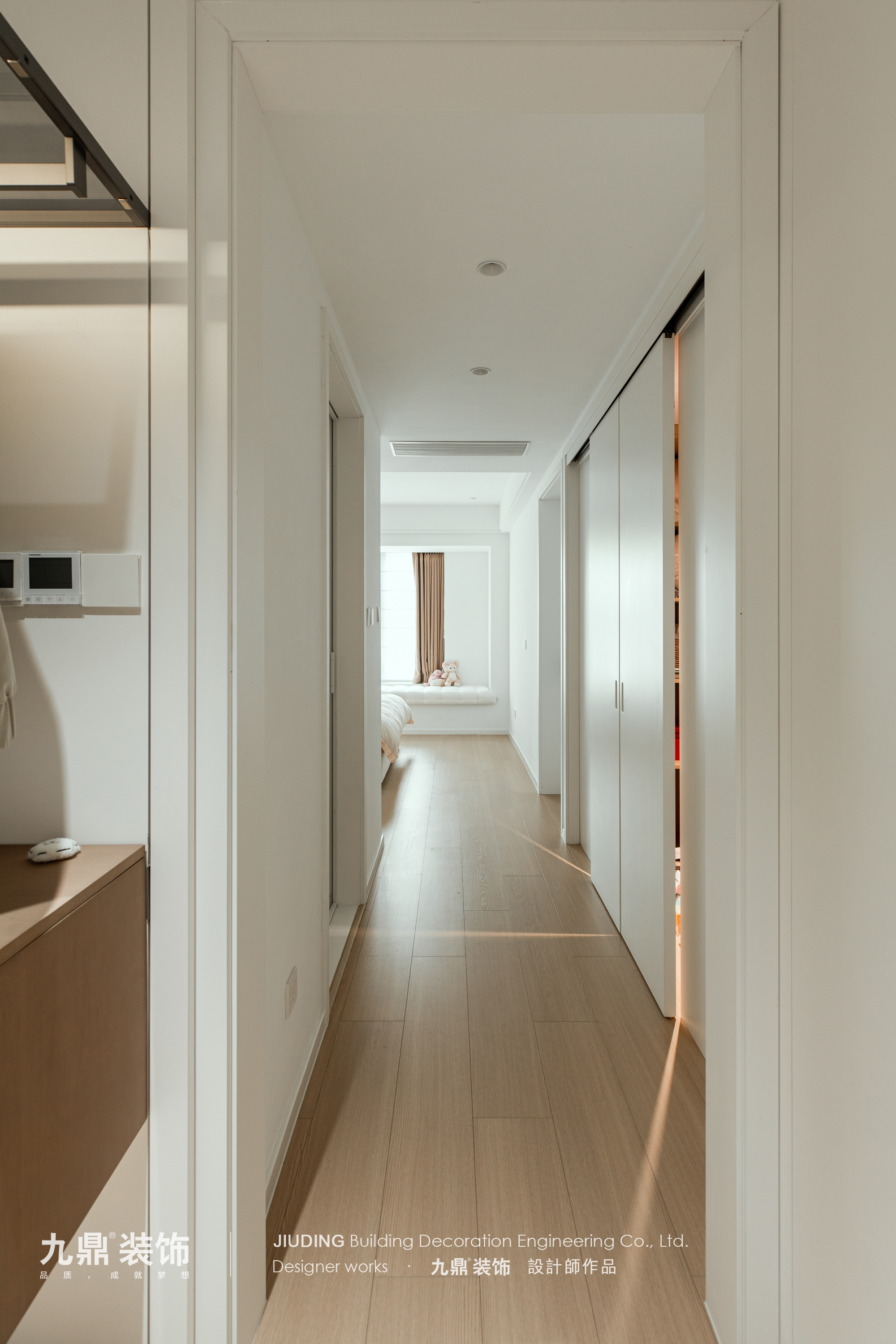 顶面采用无主灯与磁吸灯系统,摒弃繁杂造型。整体以白色为主调,护墙板、隐形门均选用白色,局部搭配原木色,营造出简洁明亮又不失温度的氛围。
