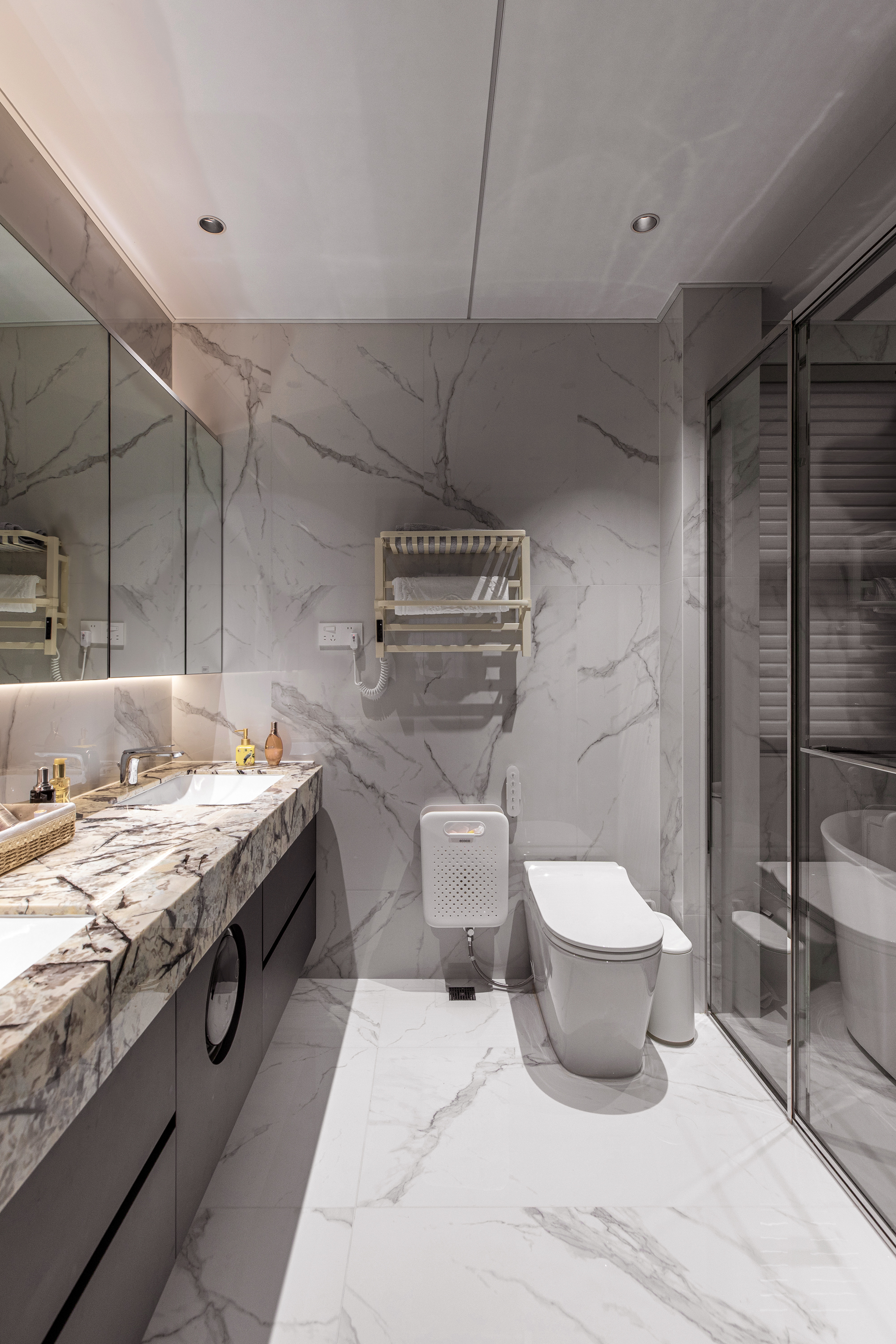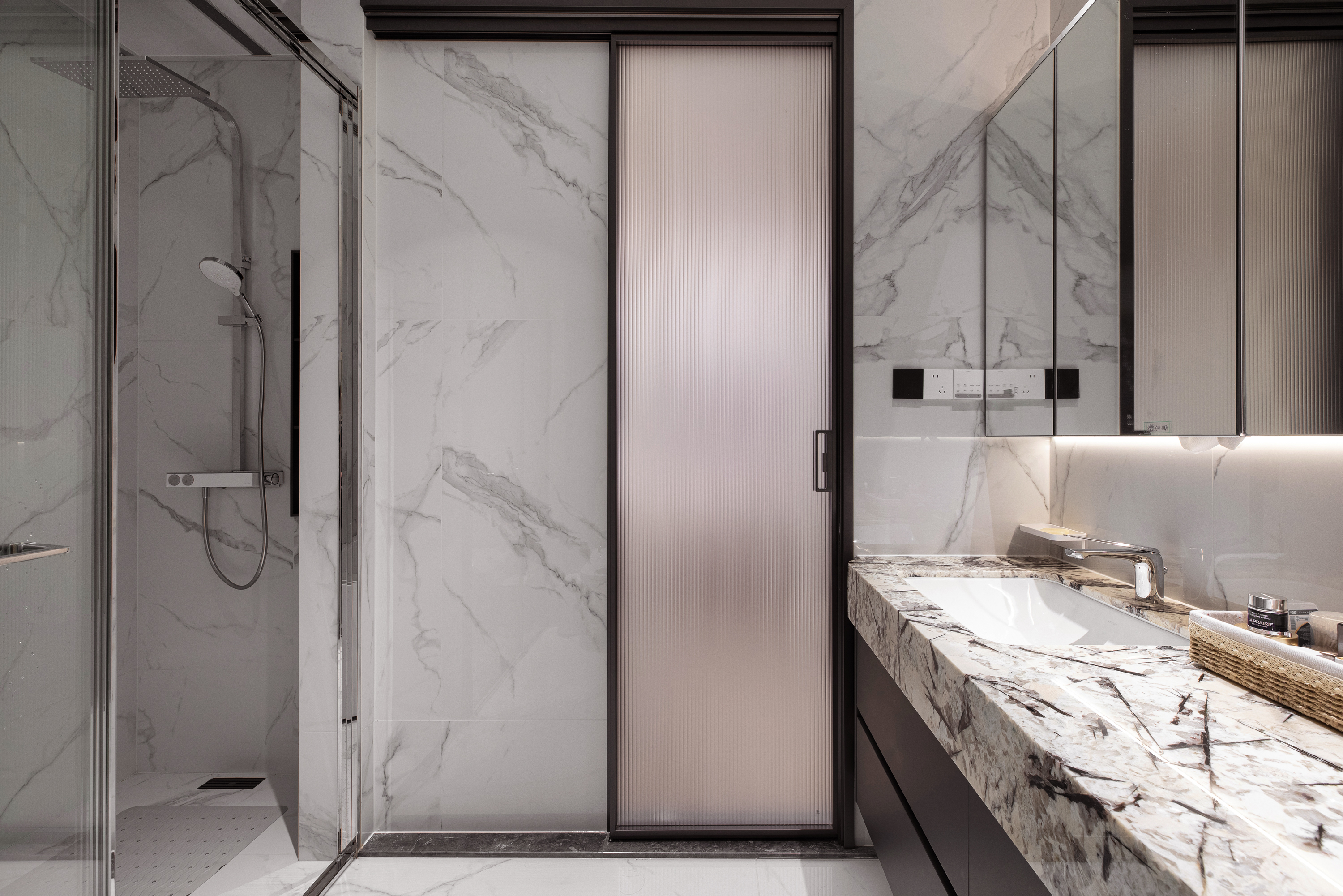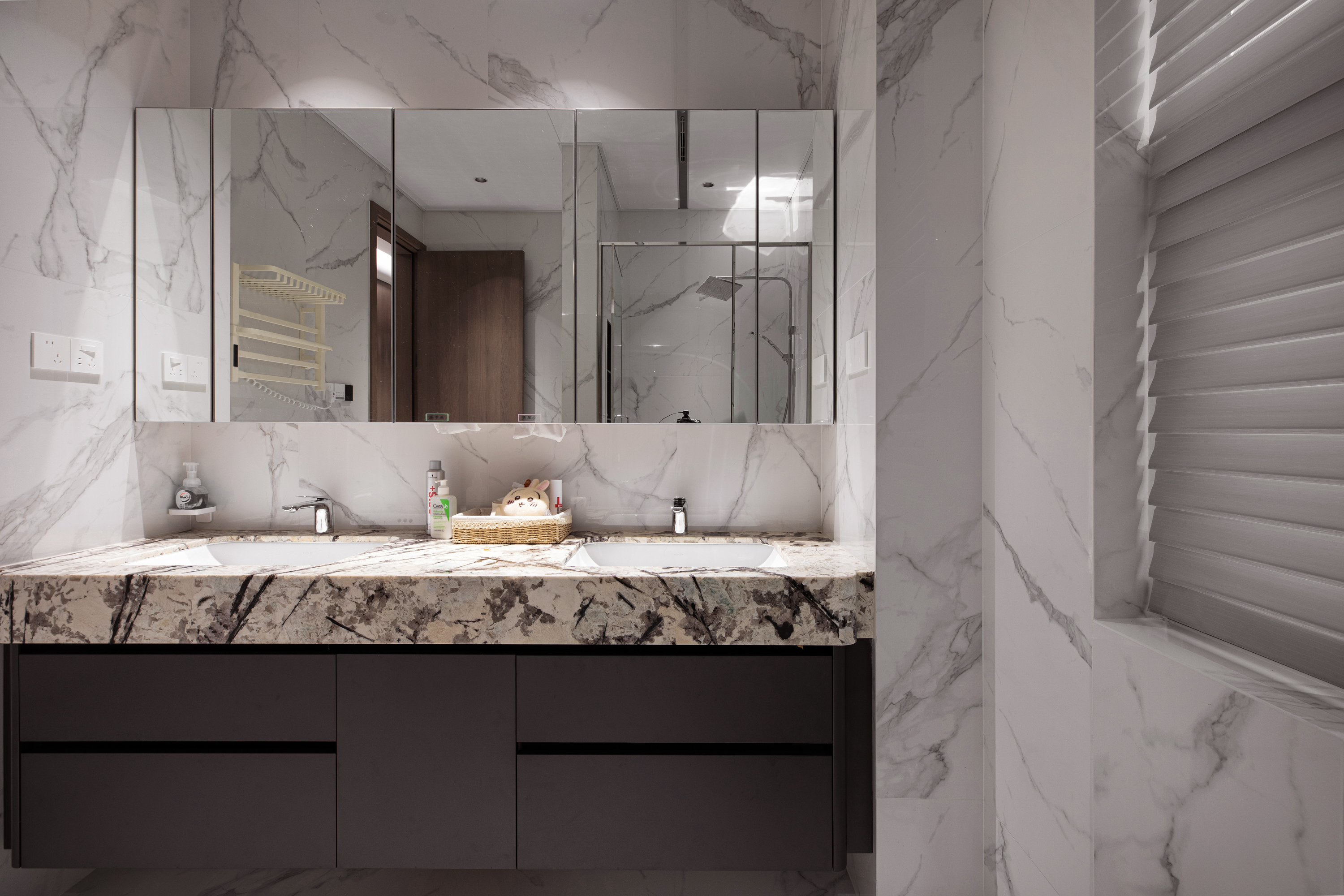 卫生间:整体瓷砖选用清爽简洁的常规款式,干净利落。而浴室柜台面则大胆使用了大理石奢石,瞬间提升整个卫浴空间的奢华感。双台盆设计,让男女主人清晨可以同时洗漱,互不干扰,从容开启一天。镜柜、储物格等收纳细节也经过精心规划,满足日常使用。