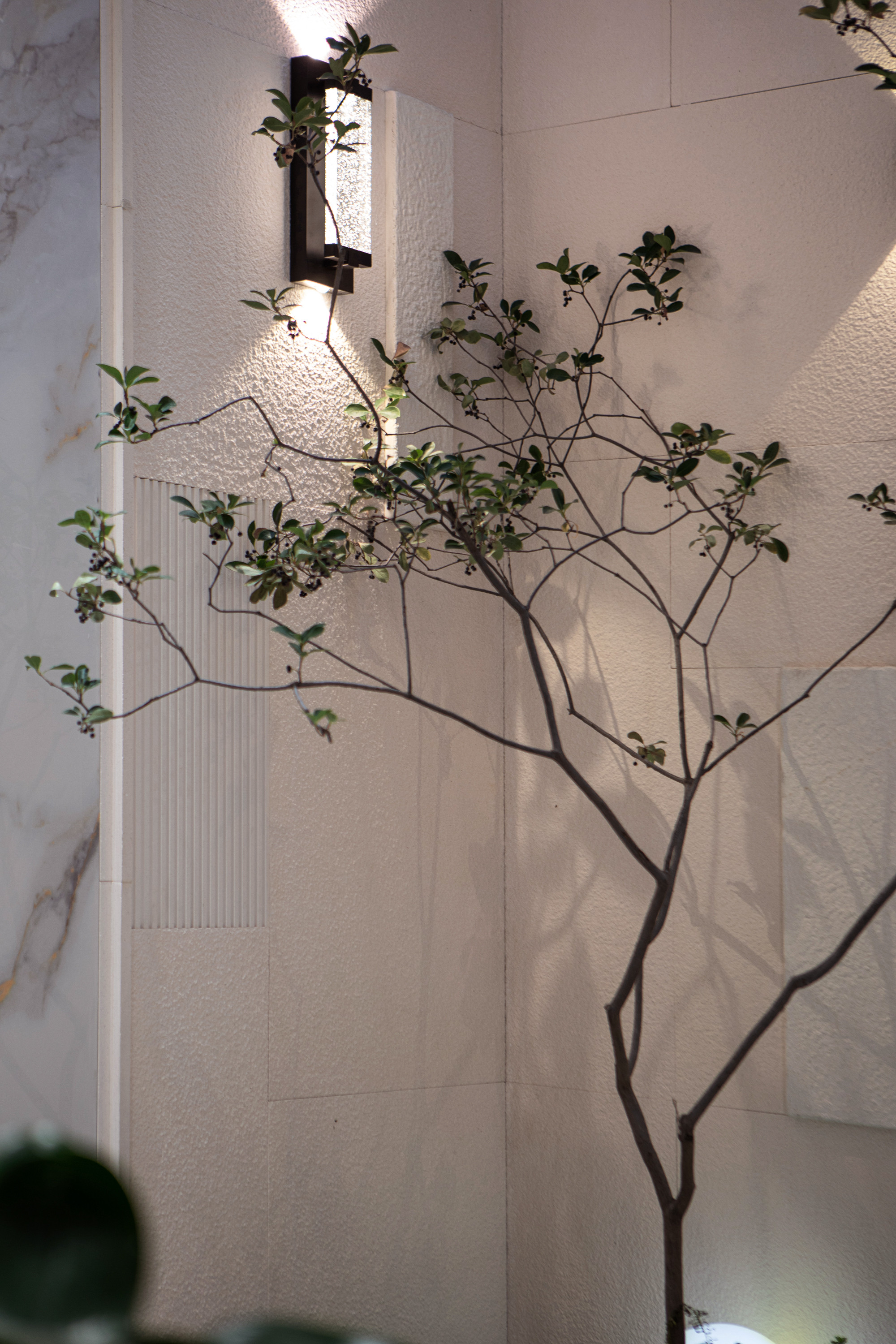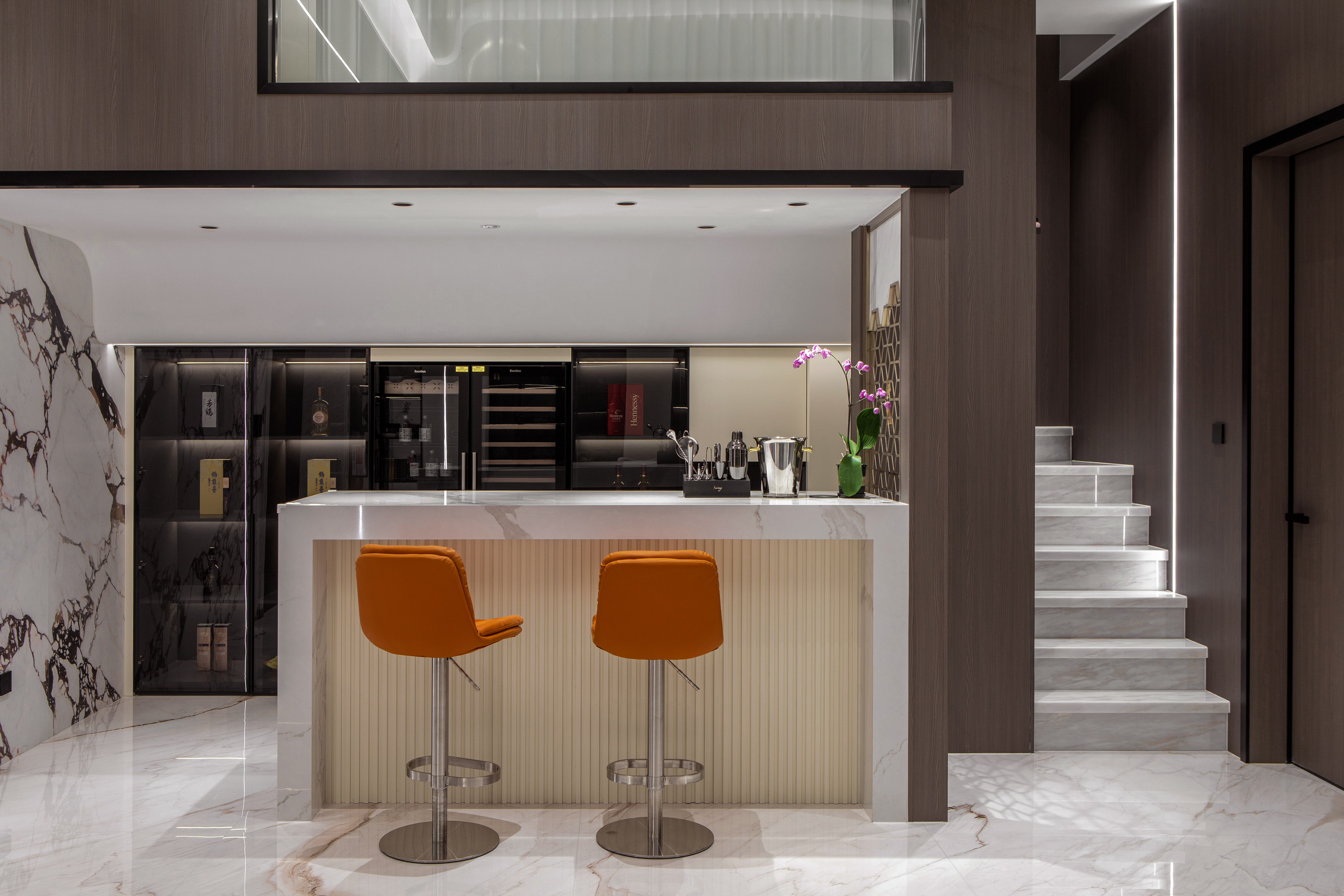 酒吧台:紧邻茶室,是一个小型酒吧台。台面使用岩板,下方为开放式层板,摆放酒瓶和酒杯。背景墙用钢板与灯光做造型,硬朗的金属质感与茶室的温润形成对比,又通过灯光柔和过渡。调一杯鸡尾酒,灯光微醺,度假的松弛感拉满。