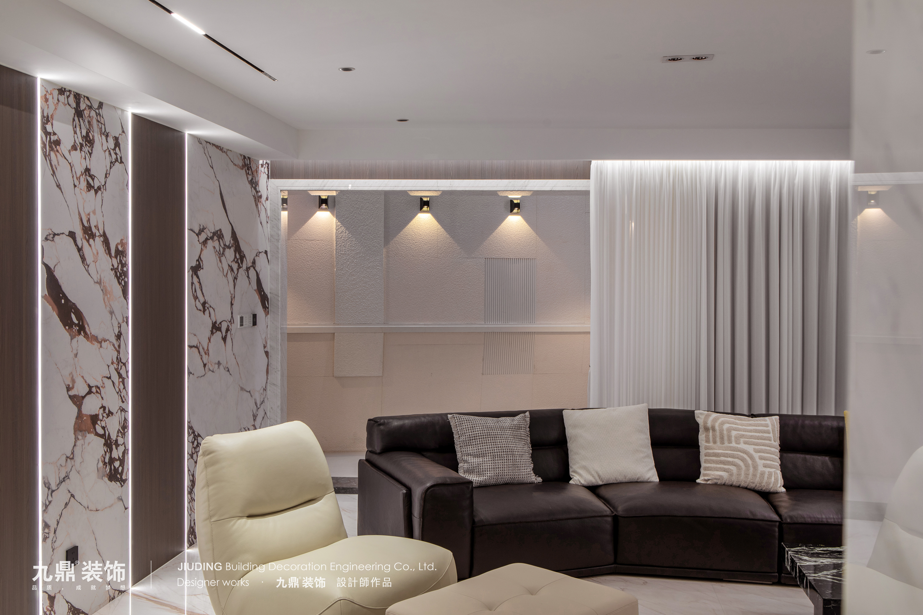 从一楼的不锈钢、岩板、蜂窝铝板,到负一层的奢石曲型造型、钢板灯光,再到卧室的米色系、木质、可调色灯光——九鼎装饰在材质选择上,既考虑美学表达,更兼顾功能与耐用。