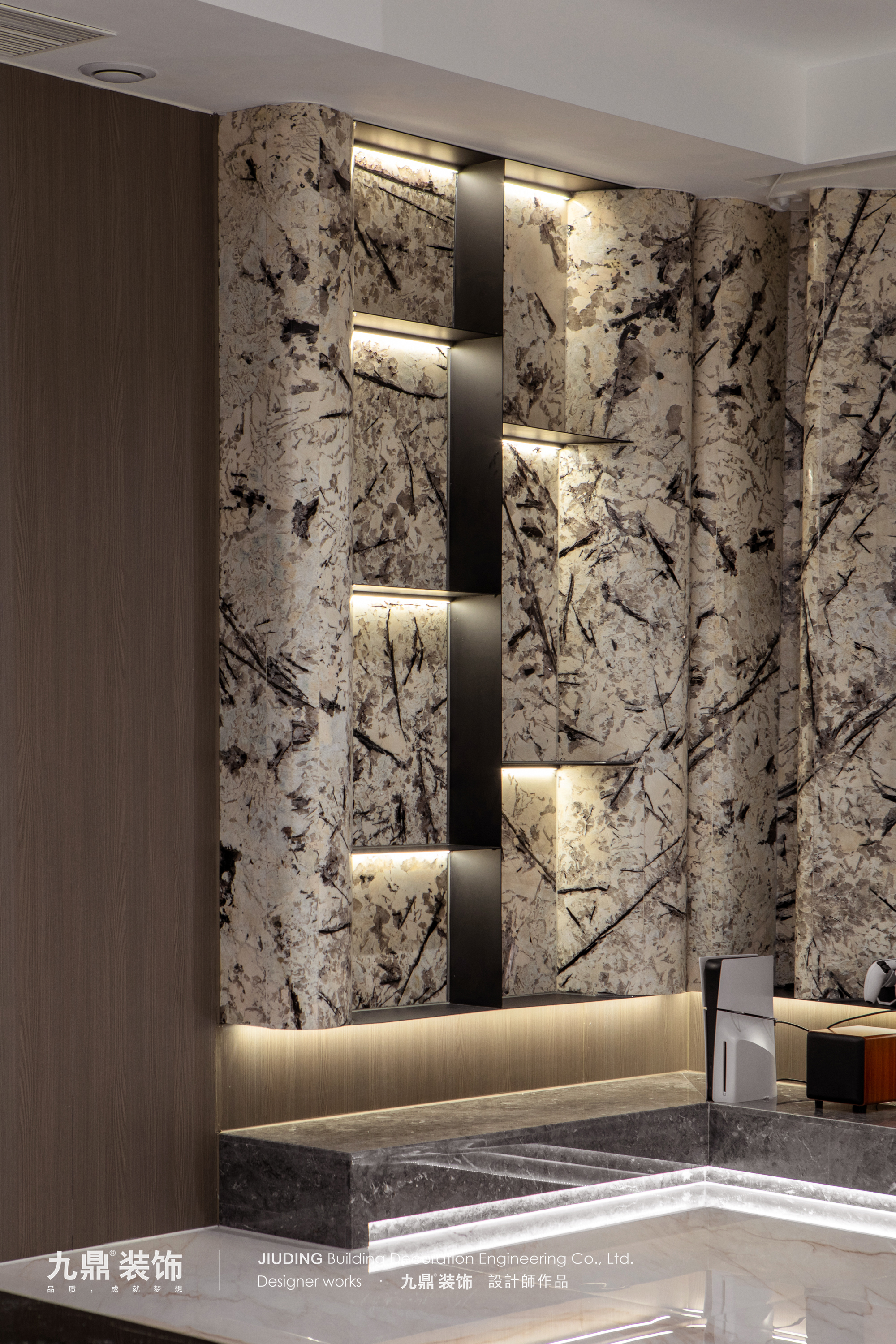 墙面延续了整屋的奢石元素,并做了曲型造型,柔化了石材的硬朗感。结合钢板层板与隐藏式灯光,让整个影音区既大气又不失温馨。