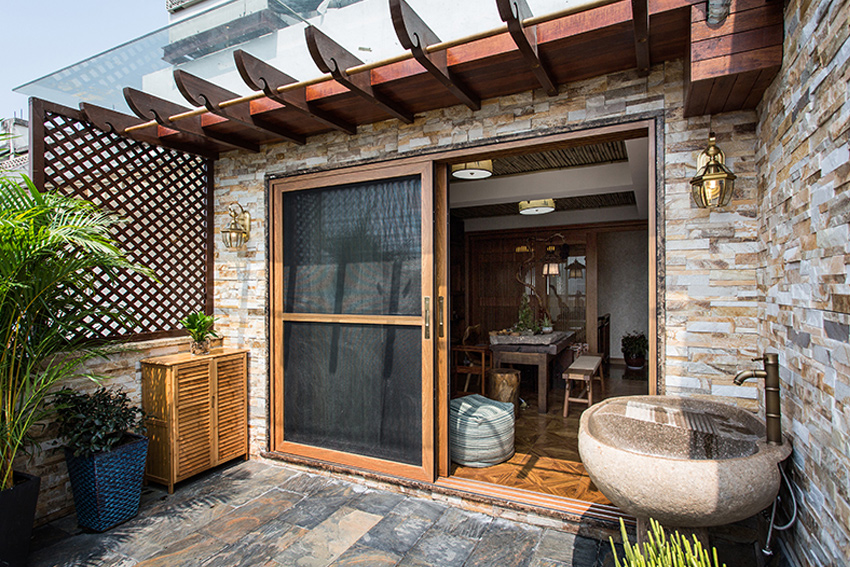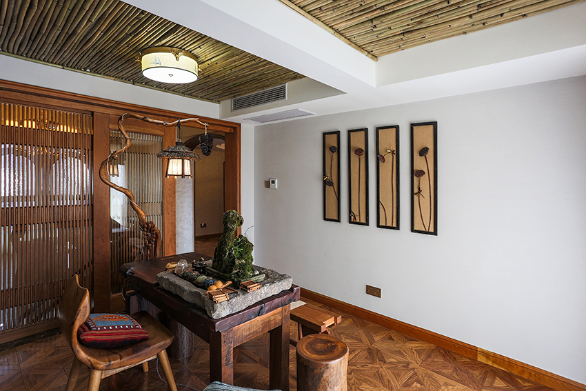 东南亚风情的灵魂透着热带气息的零散阳光,这种悠闲庸懒却不泛情调的气息,原生态的木头树桩,水潺潺流动,动静结合,光影婆娑。