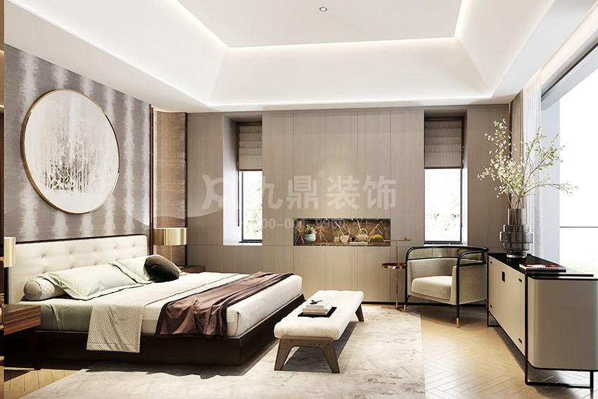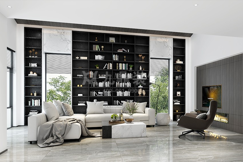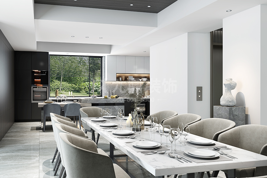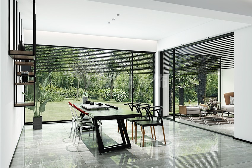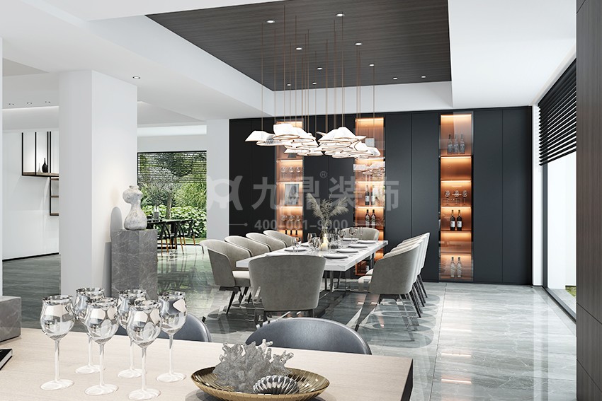 上林湖别墅装修效果图设计说明:在装饰上,现代极简装修风格体现了简洁又不简单的特点,这一点跟现代简约相似,极简风格去除复杂的装饰,改用线条和色块来做区分或者点缀,通过最简单的形式、最理性的设计手段,追求一种纯粹、无杂质的艺术效果。
