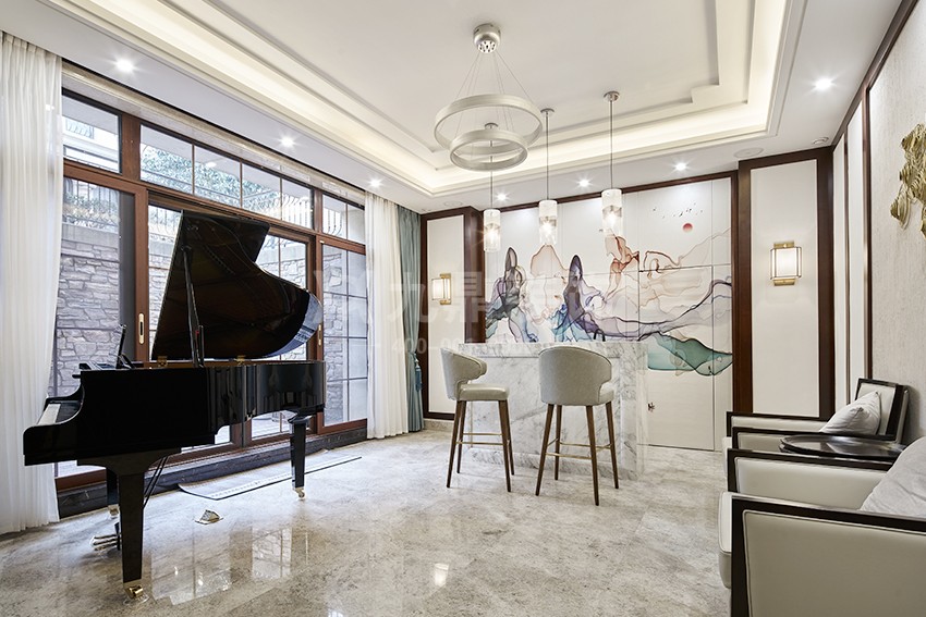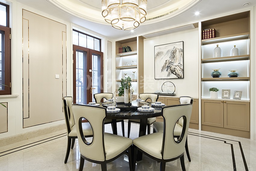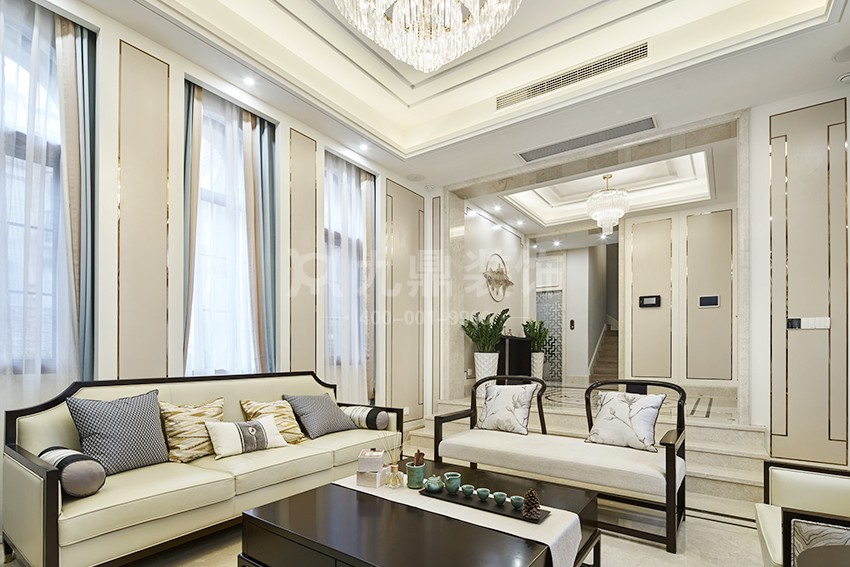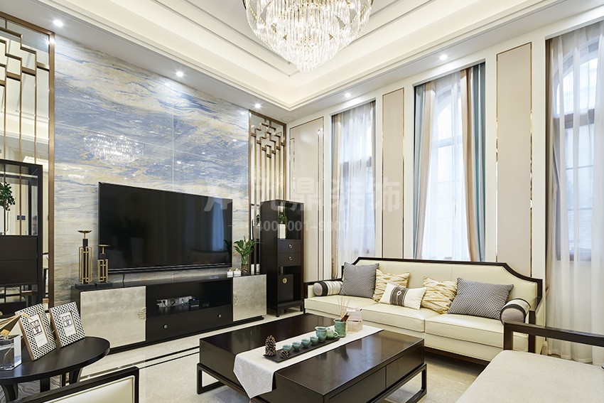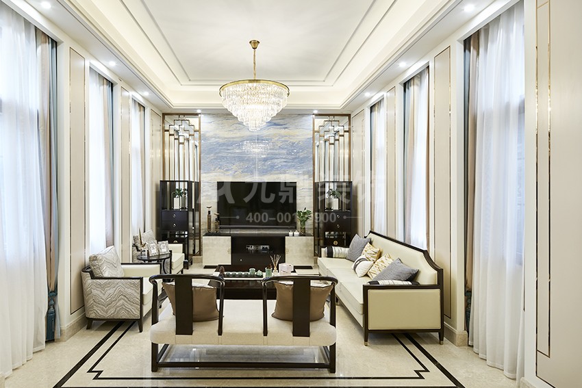 昆仑府装修效果图设计说明:奢华的视觉效果多见于欧式风格装修的空间,轻奢风格的出现让人们在家庭装修时多了一种可以选择的奢华形式,在轻奢风格装修的空间里融入中式元素,营造出的新中式风格空间多了一丝奢华与大气。