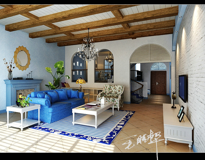 与欧式个性相同,地中海个性也是别墅多见的装修个性之一。在色彩的选用上,通常挑选天然、柔软、纯洁的蓝色和白色作为基础色,构建起地中海特有的神韵;再 配以拱门、廊道、镂空的景中窗等常用的元素,共同营建出地中海个性。别墅面积宽敞,装修地中海个性比较能展示其大方、温馨、浪漫的特点。