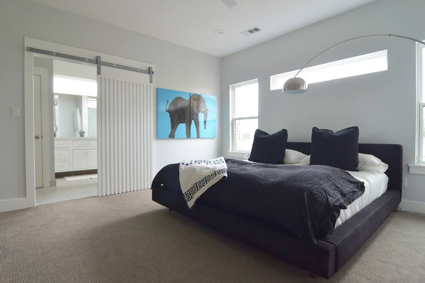 与床头相对的那面墙最好不要放过多、过高的家具,以避免视觉上的不舒适。但是我们可以在床对面贴张大的风景画,看起来也是非常的赏心悦目的;甚至可以在床尾的地面上铺一小块工艺地毯,这样的效果也挺不错哦。