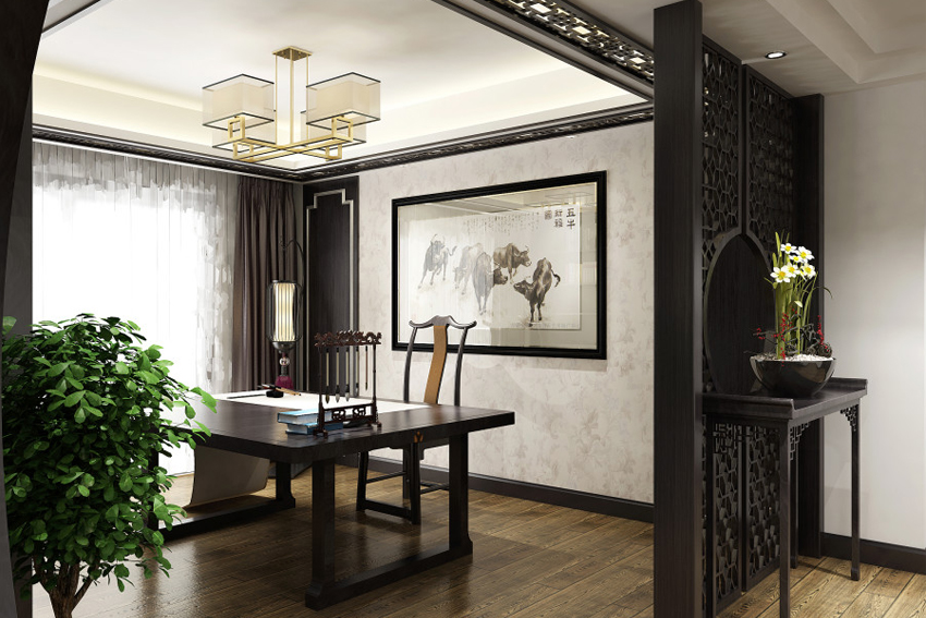 1、空间上讲究层次,多用隔窗、屏风来分割,用实木做出结实的框架,以固定支架,中间用棂子雕花,做成古朴的图案。