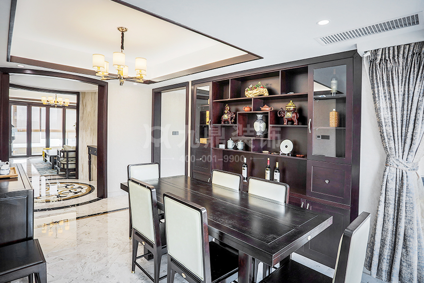 新中式注重空间层次感,空间隔断采用中式屏风或者窗棂,既能突显新中式的空间层次感,又做空间阻隔作用,其中也可以使用博古架或者垭口区分空间,展示出中式家居的层次之美。