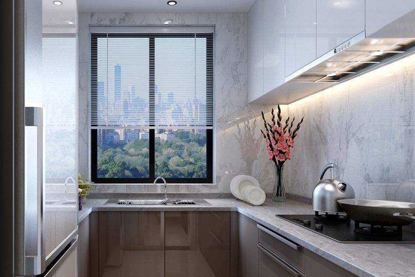 整体家装厨房翻新注意事项1:翻新厨房装修的时候一定要注意灯光的设计要明亮,这样眼睛就能不费力的看清楚要切的是蒜苗还是葱;灯泡也最好是白灯,不要装黄灯,不然,蔬果肉类的颜色易失真。记得厨房是打仗的地方,不是搞气氛的地方。现在吊顶主灯有几种做法,包括嵌灯,日光灯或流明吊顶。