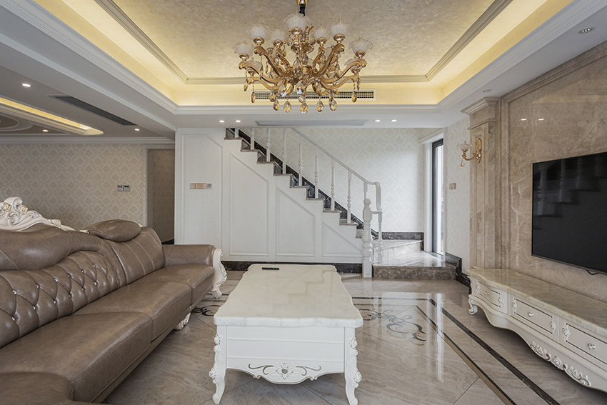 2、但不宜用全部向下配光的吊灯,而应使上部空间也有一定的亮度,以缩小上下空间亮度差别。如果房间较高,宜用三叉至五叉的白炽吊灯,或一个较大的圆形吊灯,这样可使客厅显得富丽堂皇。