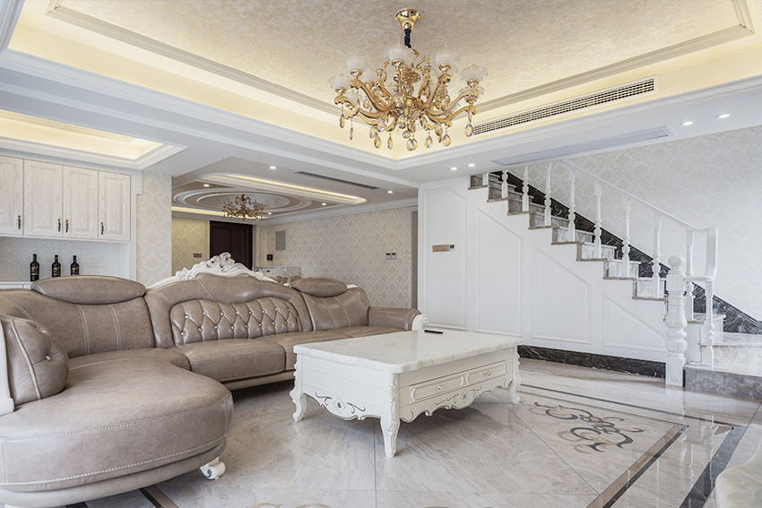 客厅就是我们常说的别墅大厅,在家居使用的公共活动空间是最频繁的,所以在别墅客厅装修中,不管做不做人工吊顶,都必须要保持空间的高度。我们可以把别墅大厅顶部拉伸层高,让整个空间看起来显得更大气,空旷。