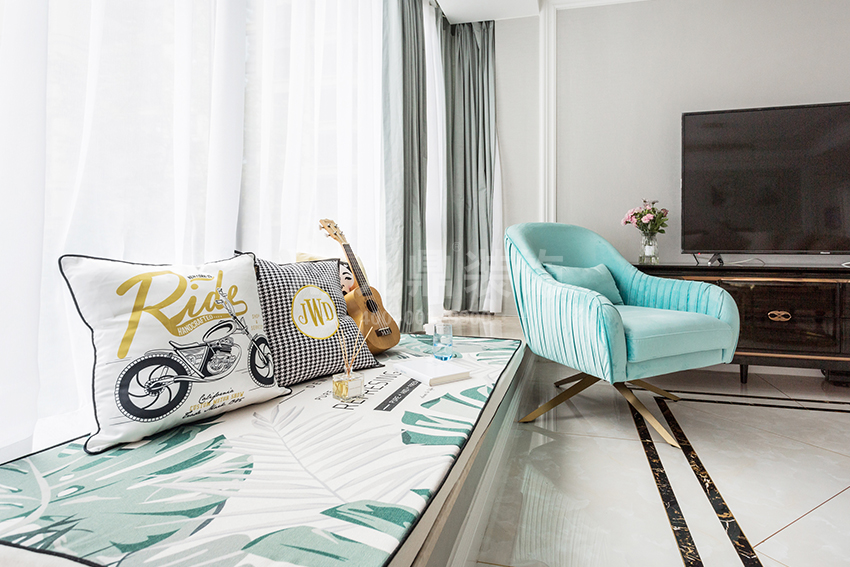 客厅是家装风格品味最直观的体现,轻奢风中的客厅设计更要把奢华和大气展现得淋漓尽致,白色的护墙和天花吊顶搭配暖褐色的地面是最适合的,可以通过雕花的纹路来凸现精致,地毯或者地垫是轻奢风中不可缺的,在茶几处可以搭配暖色系的拼花地垫,让质感在不经意中展现。客厅的软装上可以选择气质材料,结合的单椅,变换的格调,在细节上体现韵味。