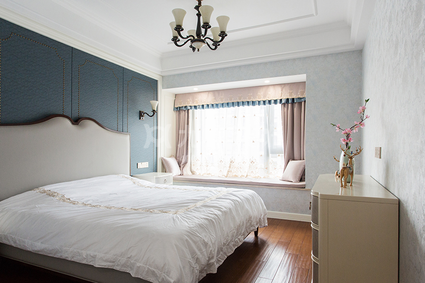 美式家居的卧室安置较为温馨,作为主人的私密空间,主要以功能性和有用舒适为考虑的要点,一般的卧室不设顶灯,多用温馨柔软的成套布艺来点缀,一起在软装和用色上十分一致。