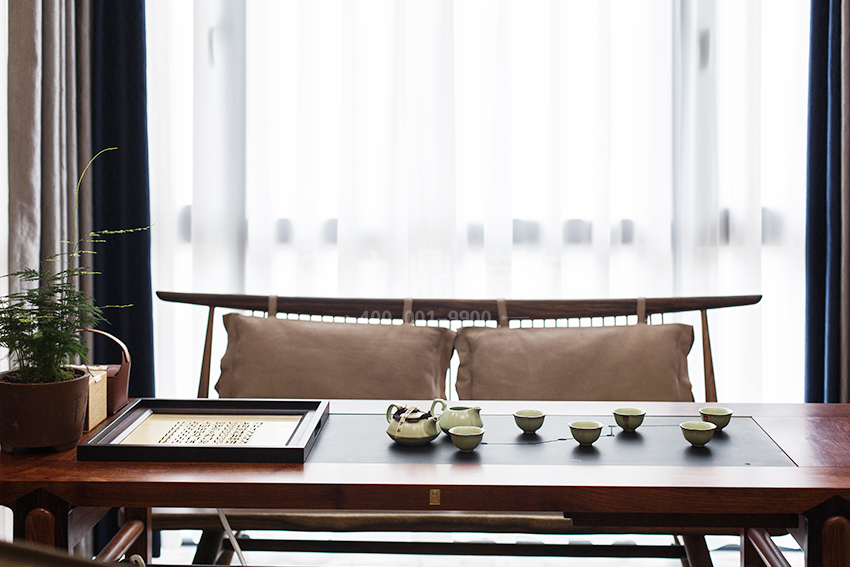 现代流畅简约的空间布局下,中式软装的运用,成为了打造空间风格最为重要的部分。瓷器、陶艺、中式窗花、字画及具有一定含义的中式古典物品等,丰富空间的视觉效果和文化底蕴。中式元素的稍加点缀,即可起到画龙点睛之用。