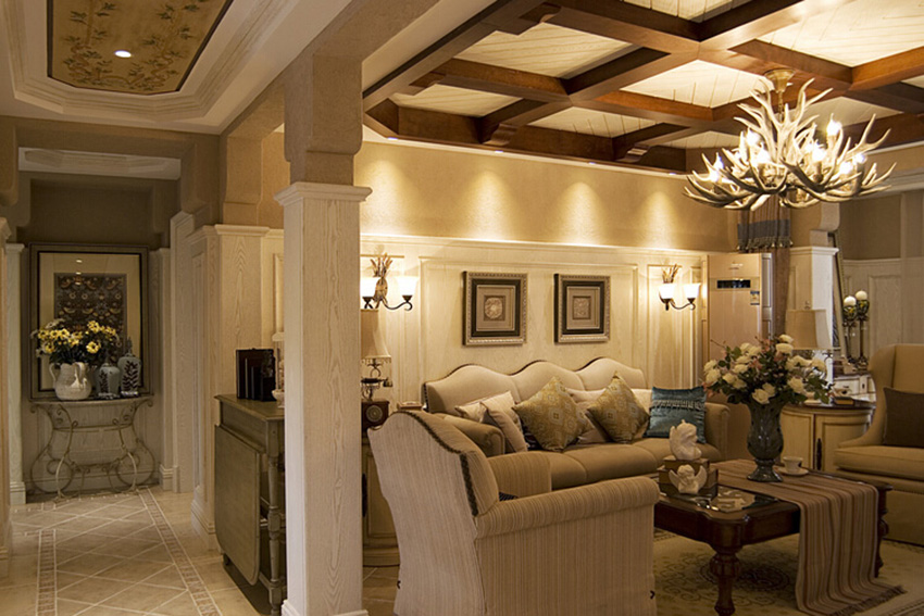 4、西班牙风格客厅:西班牙的风格建筑之间风靡国内,截然不同的地域与条件,好像都热衷做于此类风格,像中国木桶的花式吊顶,原木的桌椅搭配米色的沙发,再配上不同花色的抱枕,这样的客厅显得有些浓重又俏皮。