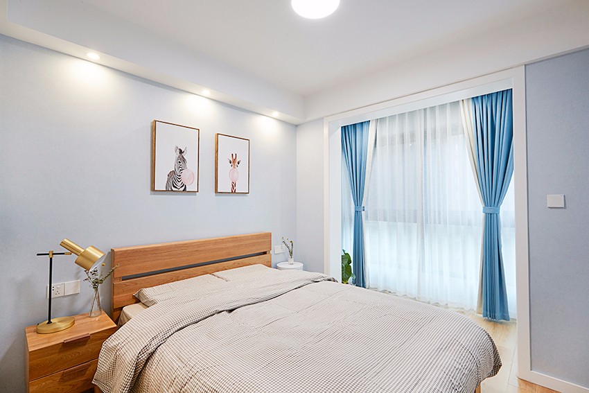 整体采用了带有灰色的淡雅颜色,走进卧室那时起,就得到了很好的放松。而在一片淡雅中蓝色的窗帘以及角落的绿植又给人带来了生机勃勃的感觉。