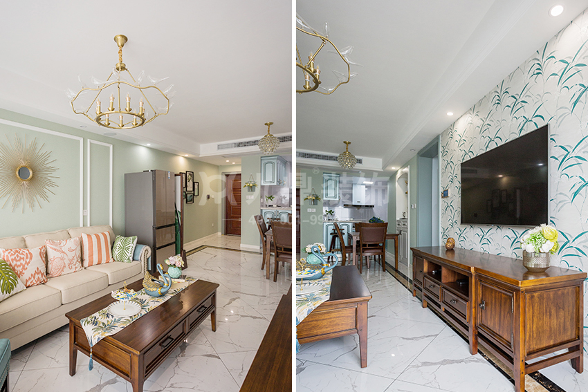 3、在造型挑选方面,一般的法式轻奢风格都是加上曲线,这是法式元素里随处可见的一种设计,而且还融合了几何框架和方正矩形的造形,那样使整个设计显得刚中带柔,恰得好处。比如:沙发、茶水案几、电视柜的矩形框架装饰和圆形吊灯的配搭非常完美。