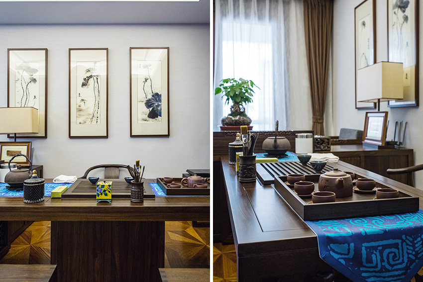室内软装设计提升餐厅的艺术装饰气氛,墙上摆放水墨画,餐桌摆放艺术花瓶。