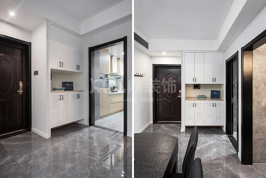 第二,跟着门的颜色走。因门是红色,在家装中,红色是个很敏感的颜色,不宜大面积使用,建议跟红色相搭的黑色和棕色等都是很好的。