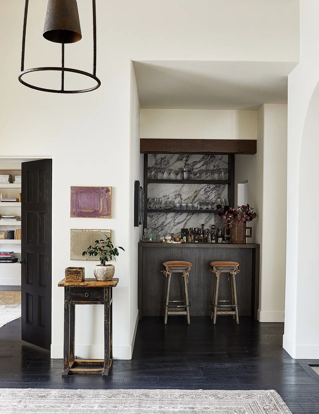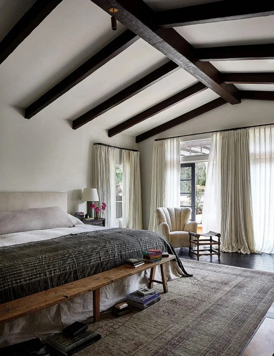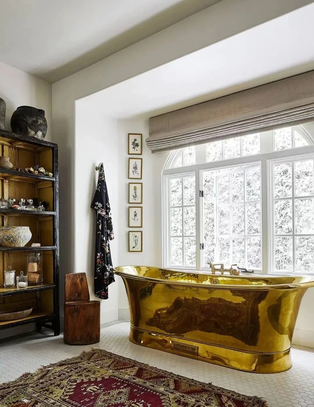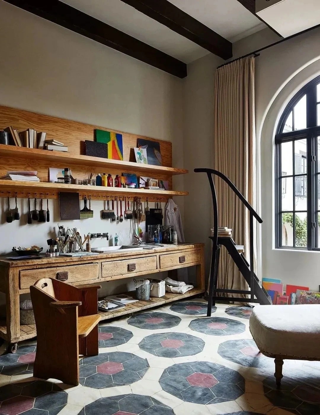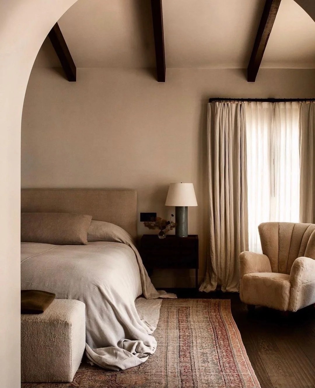 延续了整个家的大地色基调,木质与织物的柔软质感在此和谐共生。现代简约中点缀复古单品,呈现出一种返璞归真的生活美学。“在这里我能彻底放空,感受到真正的放松”,肯豆这样形容她的卧室。Rose Tarlow的台灯与Brenda Antin的地毯,成为空间中的细腻注脚。
