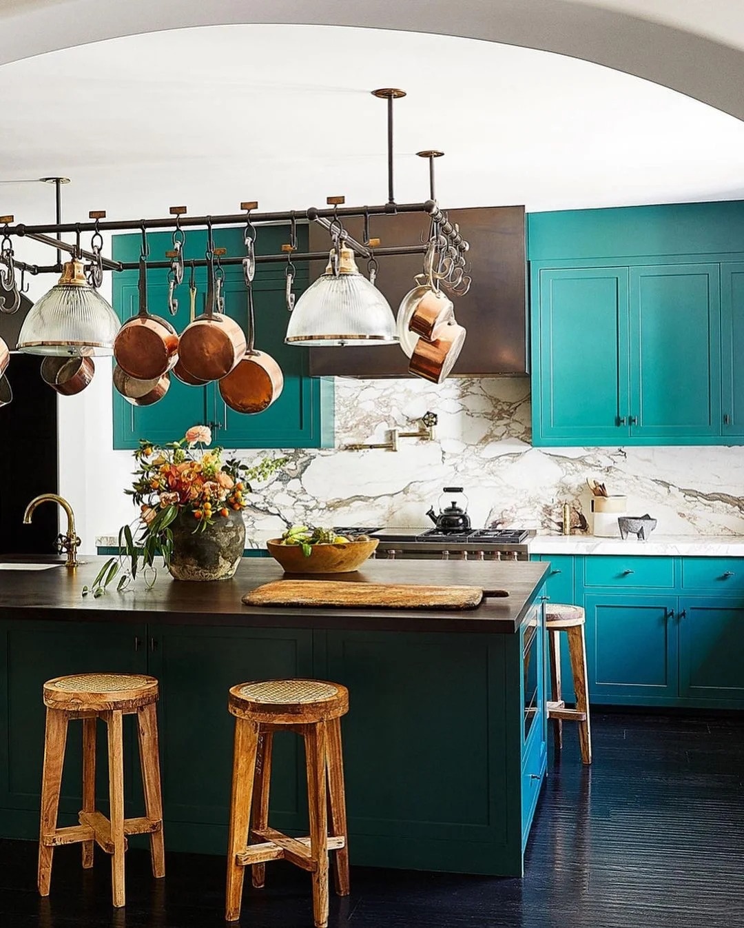 木质元素主导的餐厨区域,实现了肯豆心中“宁静西班牙混合农舍风情”的理想画面。她坦言这里是使用频率最高的角落之一,常与好友在此谈心,感受安心时光。柚木餐凳出自建筑大师Pierre Jeanneret之手,搭配一张土耳其古董地毯,新旧对话间,空间更添深度。