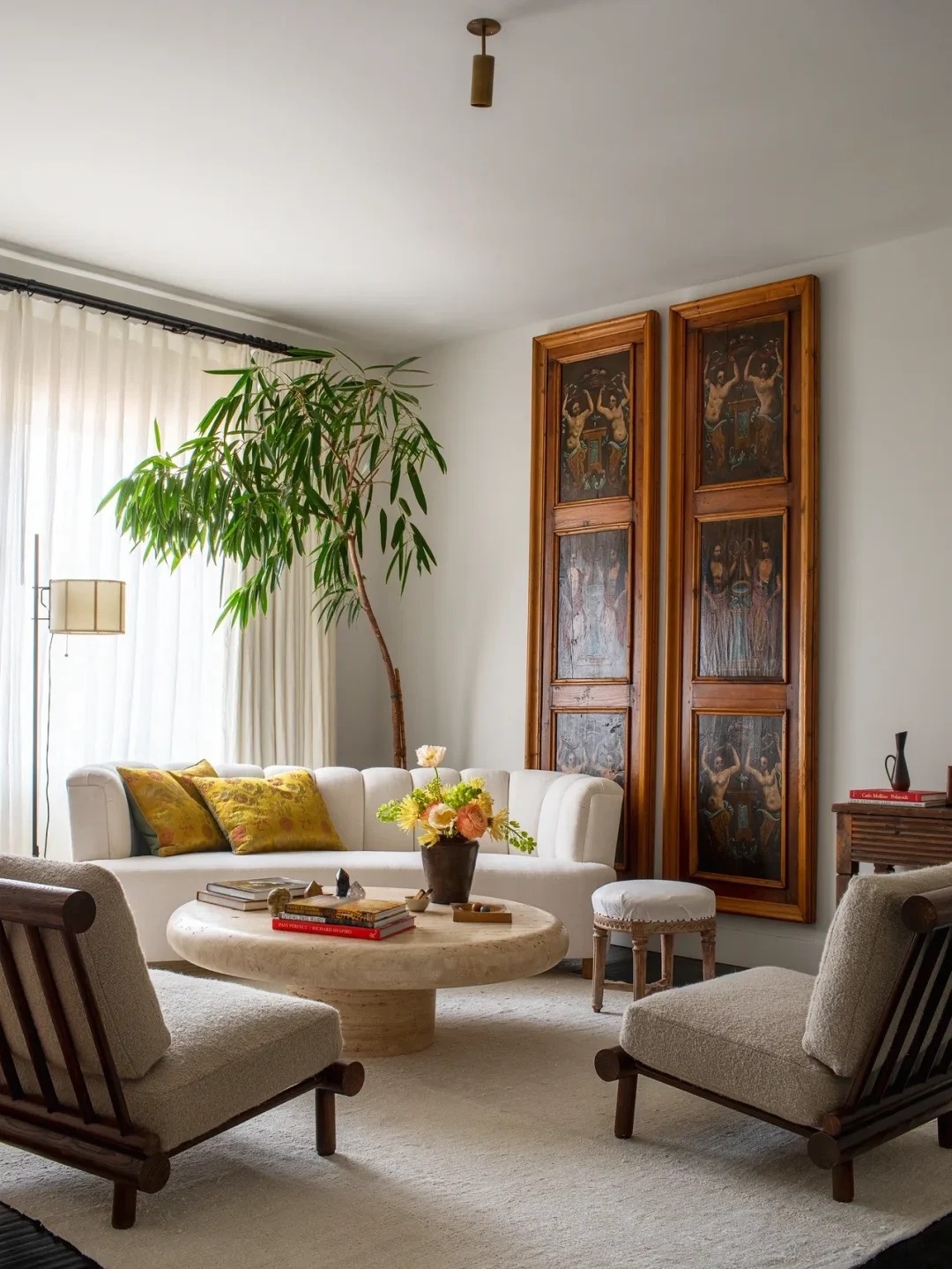 整个空间被自然光照拂,绿意点缀其间,浅色调的软装简约却不单调。Vintage家具与艺术品交织出宁静治愈的氛围,浅色地毯与沙发彼此呼应,客厅甚至不设电视,营造真正可沉浸的交流空间。抱枕来自Richard Shapiro、Pat McGann与Brenda Antin等设计师品牌,地毯则选自Woven,每一件单品都藏着时光的故事。